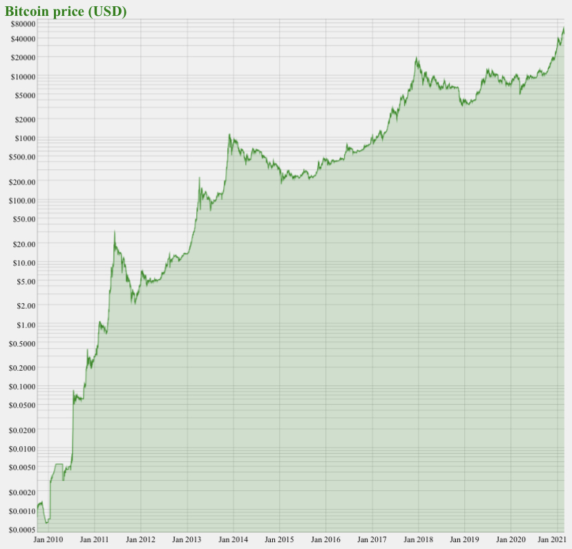 So if it is a speculative play it is vulnerable to being dethroned by a superior product and plummeting in a dot com fashion. It was clearly an amazing choice in 2010 but in 2021 I have serious doubts. I hope it isn't the best crypto can offer because of it is I am not sure how scalable the tech can be given the massive energy footprint. It makes little sense to pile on this late in the game and I don't believe for a second it will find governmental adoption among any of the major economies.I agree it’s a speculative asset but here’s an all time BTC chart. It has 10x’d every 3-4yrs. Institutional buyin makes it slightly less speculative at this point. The fact that it’s decentralized makes it less susceptible to government intervention.