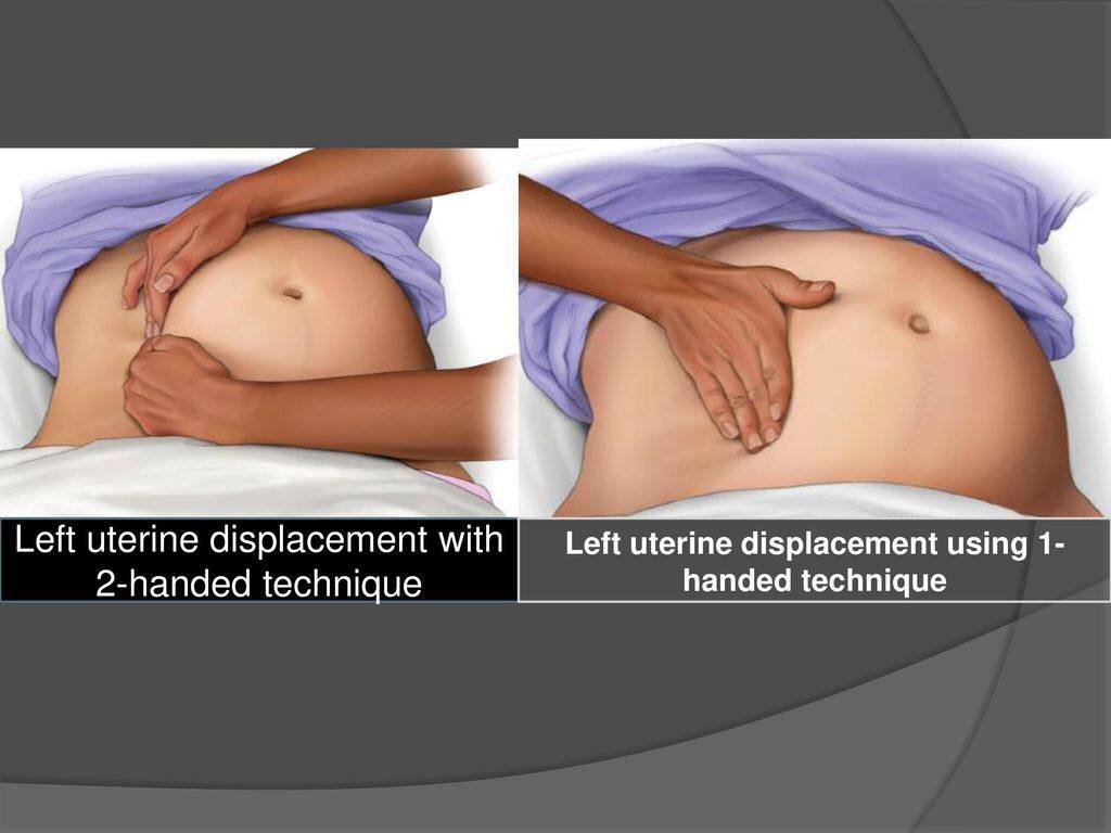 During CPR; to improve the quality left uterine displacement is advocated to remove the aorto-caval compression. This is done manually by 1-hand or 2-hand technique or by using a wedge of predetermined angle.
