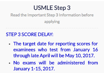 STEP 3 Score Delay: "The target date for reporting scores for examinees who test from January 16 through late April will be May 10, 2017."