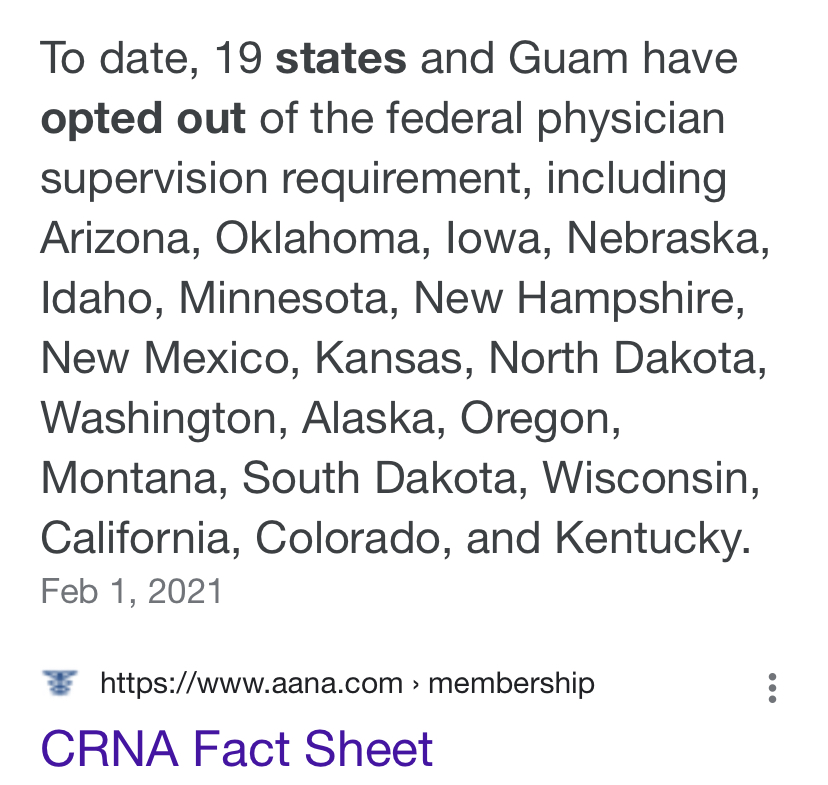 Im sorry but this view is only partially correct. I dont want to argue too much, but if we submit ourselves to a futile standpoint here we’re even more ****ed. Again, in states where doctors make a stand, doctors have won. Please see FL, SC etc policy on CRNA practice.Agree. We are no different than any other industry. “Progress” means what can be consolidated will be consolidated, expensive labor will be replaced with cheaper labor, what can be automated will be automated and what can be off-shored will be off-shored.
