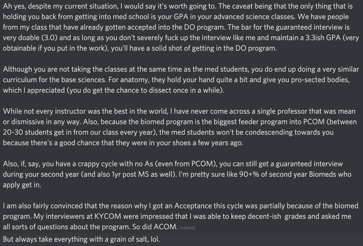 I've read in multiple situations where students have attended PCOM's Masters Program, met the requirements for conditional acceptance and adcoms still didn't accept them into their med school. While my opinion on the program is very limited and all that I've mentioned about is hearsay (friend of a friend kind of situation lol), I'm very hesitant about moving forward.