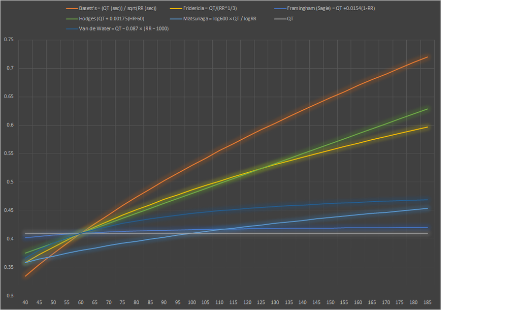 I've attached an example of what happens when you correct for different heart rates using common methods based on an arbitrary measured QT of 0.41 seconds.