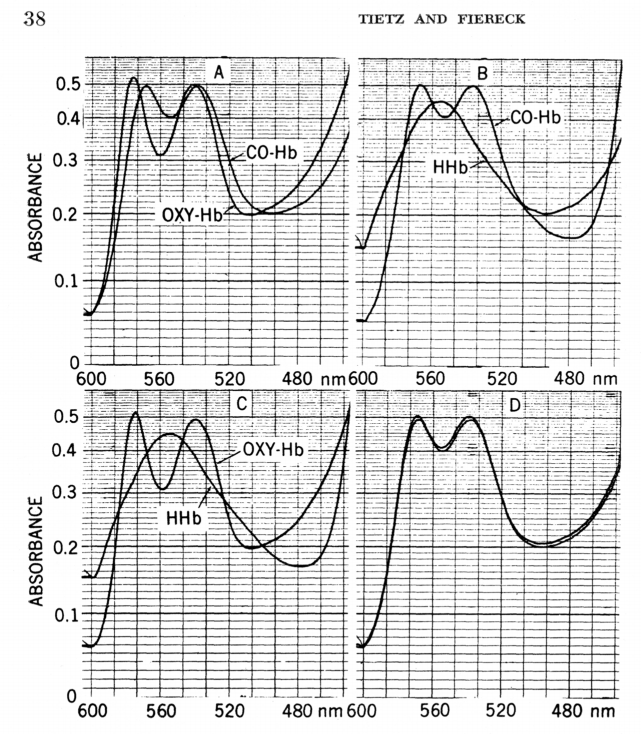 One quick (and relatively insensitive) method to detect acute CO poisoning is to take a blood sample, dilute it and mix it with 5% NaOH. A pink tint in comparison with the colour obtained from a normal blood specimen (I've been told it'd be brown-ish?) suggests the presence of carboxyhaemoglobin.