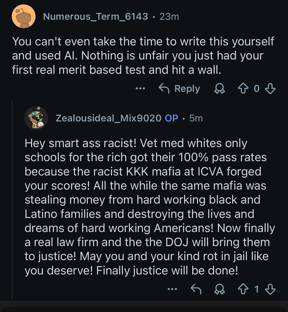 Then you have the crazy that stays on reddit. In the vet world most of it is pre-vets coping by shifting blame to schools/admin.