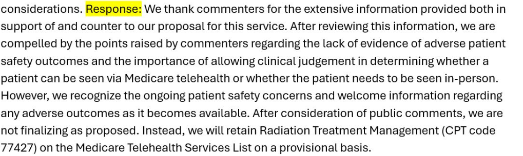 You should also check if using telehealth affects your RVUs, 77427 is a significant RVU generator for most Rad Oncs.