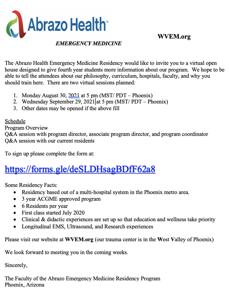 To sign up please complete the form at: Virtual Open House -Abrazo Emergency Medicine