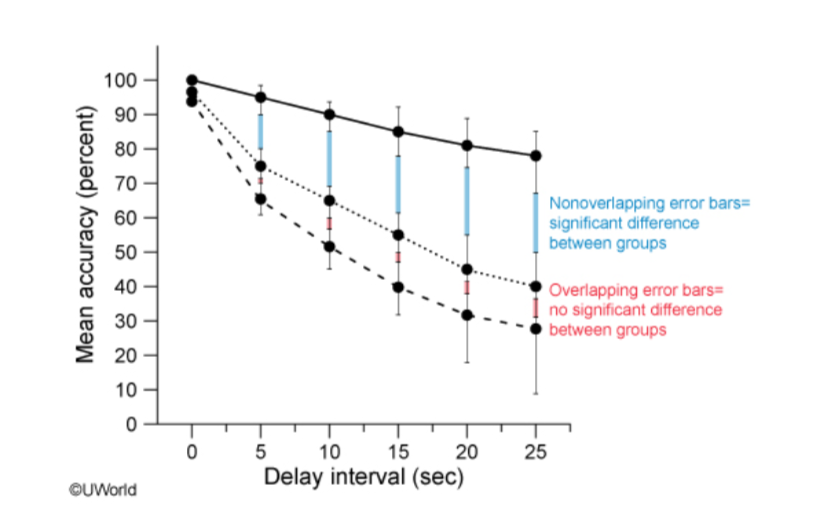 Going from top to bottom let’s call data groups 1,2, and 3. For groups 1 and 2, there is no overlap in error bars. The error band for group 1 and the error band for group 2 are not touching/overlapping. The error bands for groups 2 and 3 are overlapping, i.e. the lower end of the error band for group 2 is lower than the upper end of the error band for group 3.